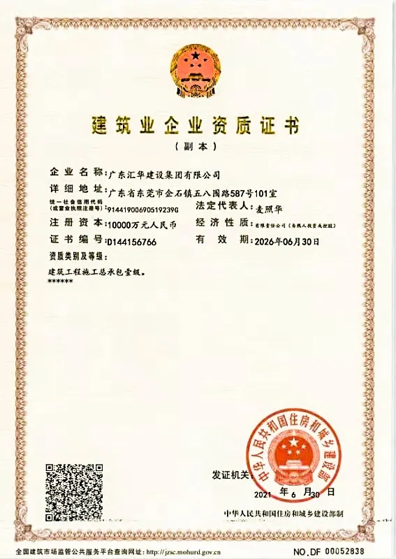 2021年6月30日,經(jīng)住房和城鄉(xiāng)建設(shè)部審核批準(zhǔn),廣東匯華建設(shè)集團(tuán)有限公司獲得了建筑工程施工總承包壹級(jí)資質(zhì)。